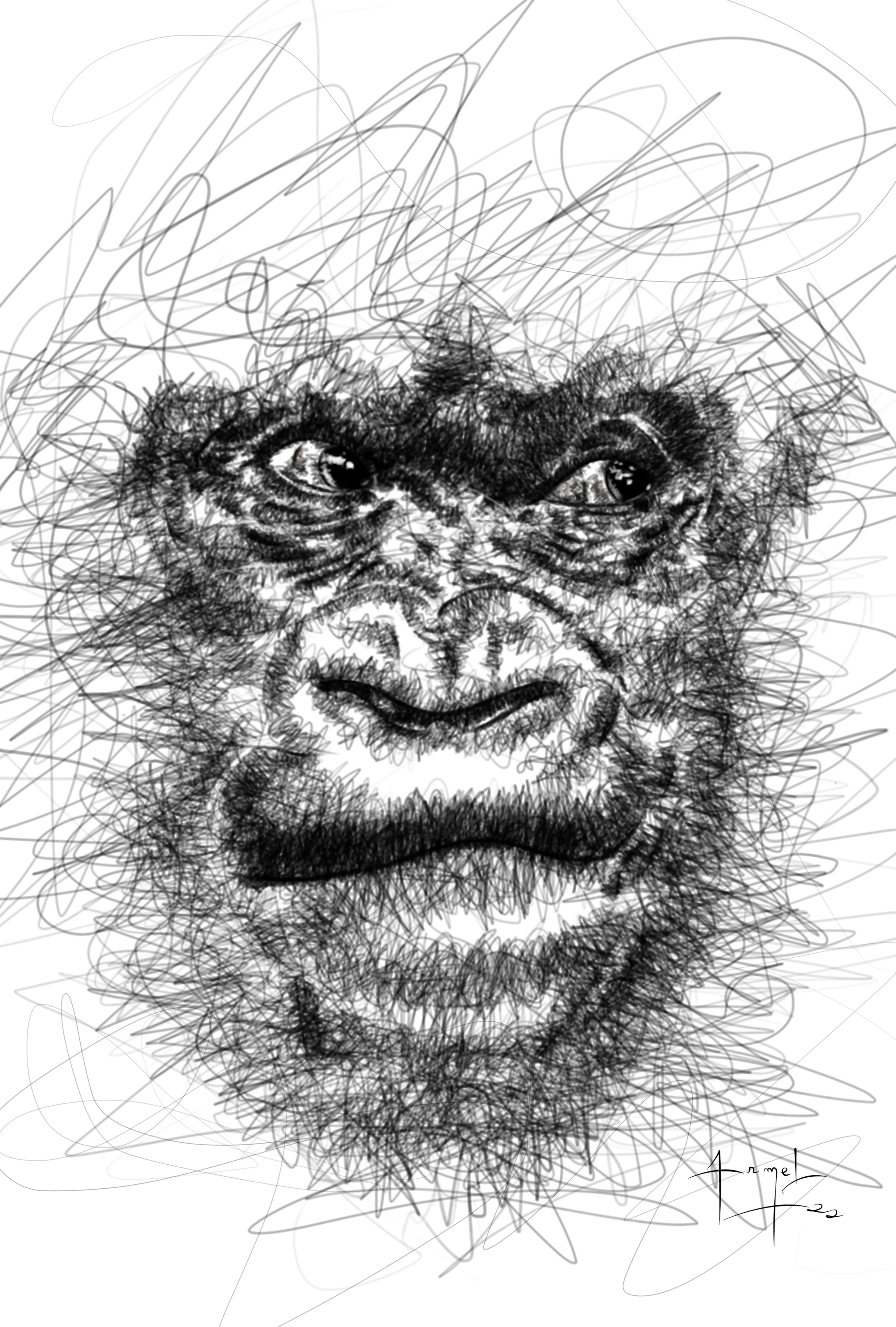 A gorilla face created with a scribbling style